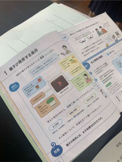 5年生の理科では、「植物の発芽と成長」の単元で、植物が発芽する条件について考えていました。これから、考えた条件別に大豆をカップに植えて検証実験します。