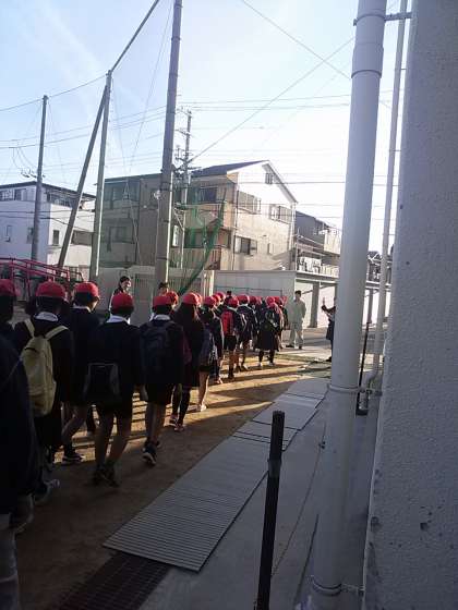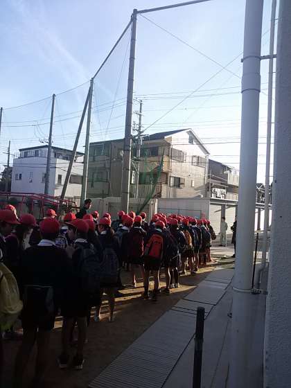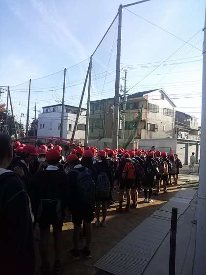 早朝から運動場に集合、今から長居陸上競技場に向けて出発です。