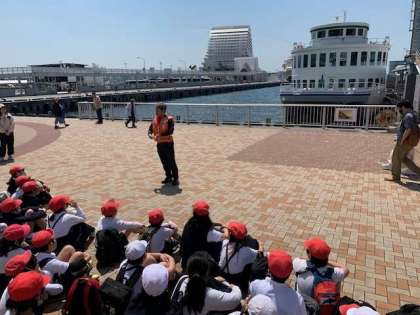 神戸港に着きました。今からロイヤルプリンセス号に乗って神戸港をクルーズします。万が一、海に落ちてしまったらどうするか、係の人から説明を聞きました。