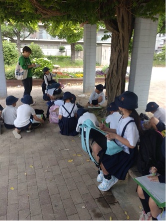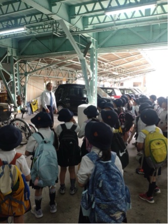 今日は2年生が「まちたんけん」に出かけました。地域の人からお話を聞きました。