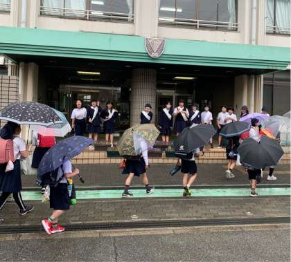 姫島小学校では今日から1週間、あいさつ運動が始まりました。今朝はあいにくの雨天でしたが、雨を吹き飛ばせそうな元気なあいさつの声が飛び交いました。