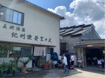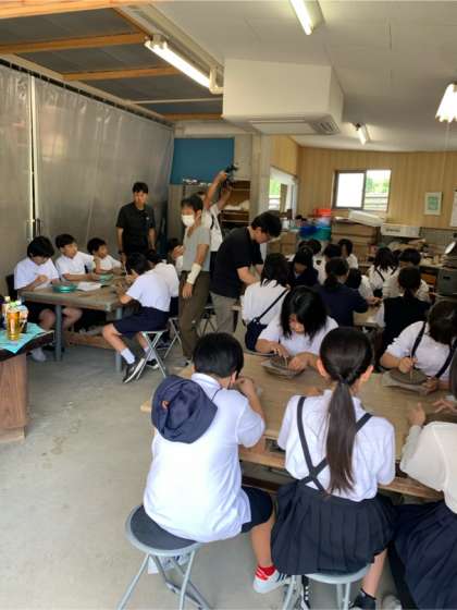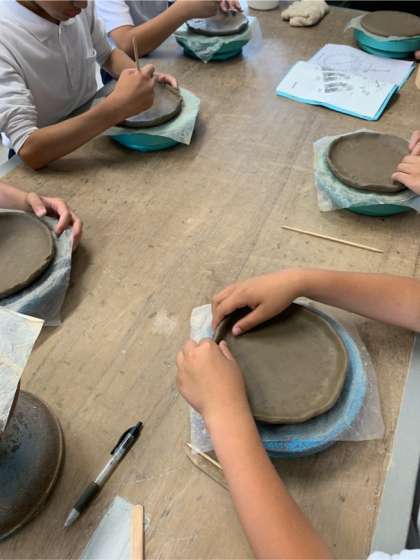 1組は陶芸体験をしています。お皿の形を作って、絵を掘っています。