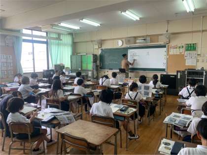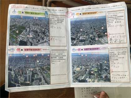 3年生の社会科の授業です。先週、社会見学で、あべのハルカスの60階に上って見てきた大阪市の様子について、意見を出し合いました。