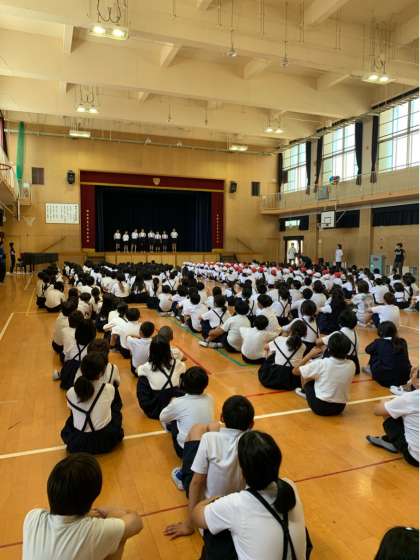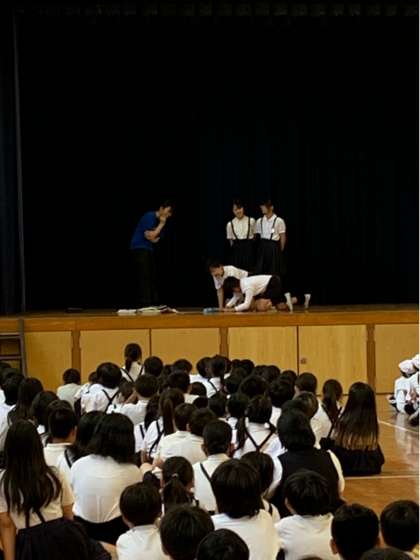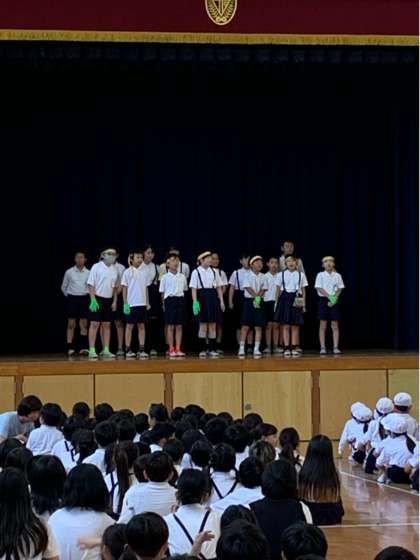 今日のお昼休みは児童集会で全校が講堂に集まりました。児童会の人が、来週の「ろうかを歩こう週間」の説明の劇をしてくれて、とても盛り上がりました。