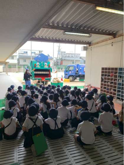 今日は4年生の出前授業で、大阪市環境事業センターからパッカー車が学校にやってきました。