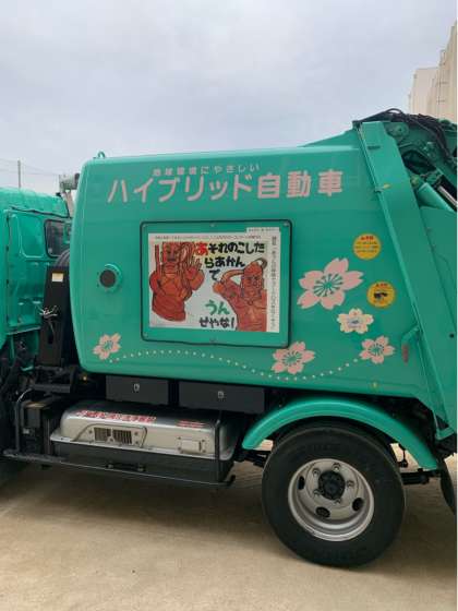 子どもたちから募集して選ばれたポスターが、パッカー車の側面に貼ってあることも教えてもらいました。