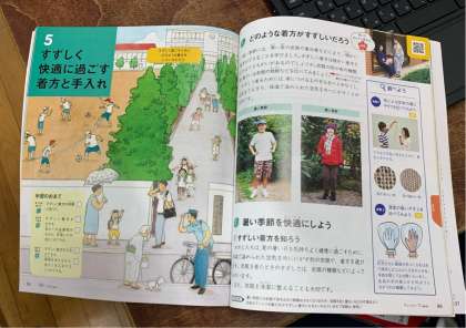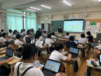 6年生の家庭科の授業です。暑いときと寒いときの衣類の選び方について班で話し合い、まとめたデータをクラスで共有しました。