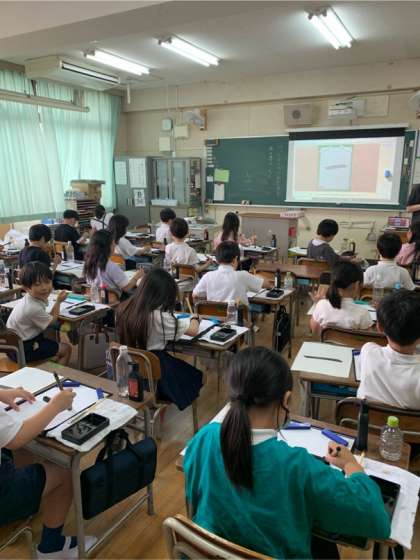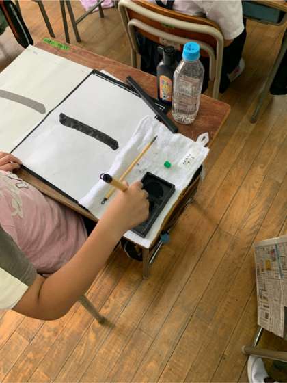 3年生の習字の授業です。習字は3年生から始まります。習字用具の使い方や、習字の授業の手順を一つひとつ覚えていきます。