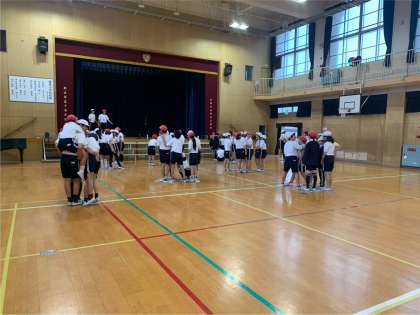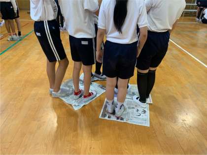 どんどん半分に折っていって、面積をせまくしていく新聞紙の上に、グループで協力してはみ出さずに乗るゲームで盛り上がりました。