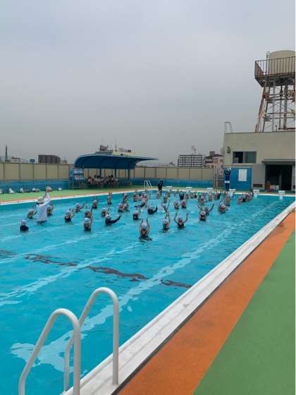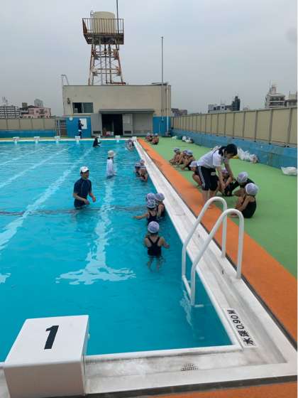 1年生のプール水泳の様子です。小学校ではじめてのプールの時間です。合図を聞いて、プールの中に入ったり、出たりする練習をしました。そのあと、ミッキーマースマーチの音楽に合わせて、水の中で体を動かしてみました。