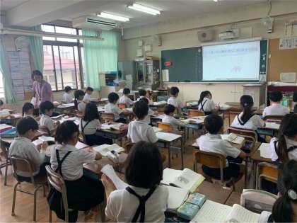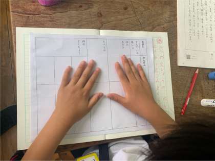 2年生の国語の授業です。黒板のめあてをノートに書き写して、ワークシートをのりで貼りました。