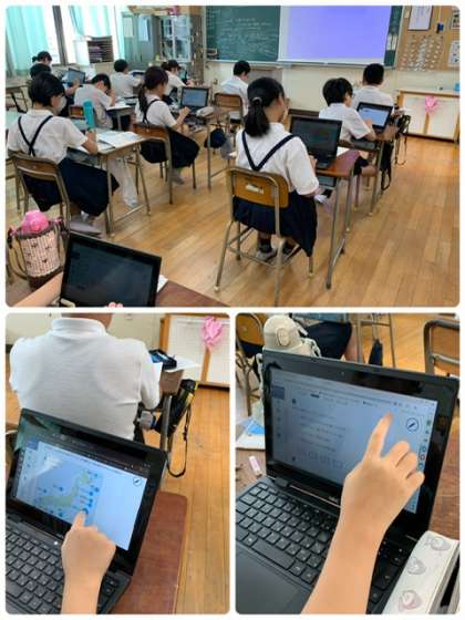 5年生の教室です。課題が早く終わった人から、個々に、デジタルドリルで、苦手な教科の学習内容を復習しています。