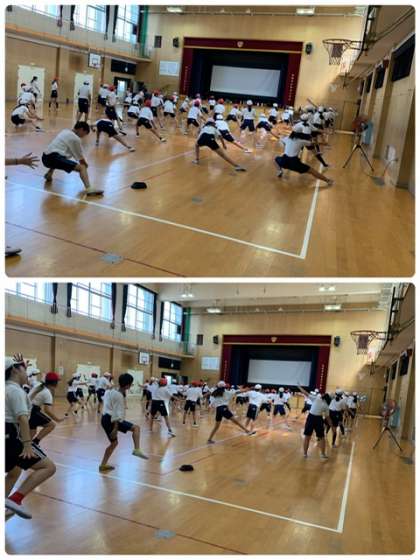 6年生の体育の授業です。運動会の団体演技で踊るソーラン節の練習が始まりました。夏休み中に、タブレットで動画を見て動きを覚えてきています。素晴らしい!