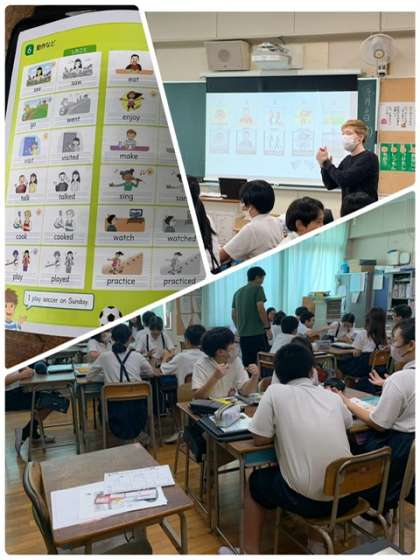 6年生の英語の授業です。よく使う動詞の現在形と過去形をゲームをしながら、覚えています。