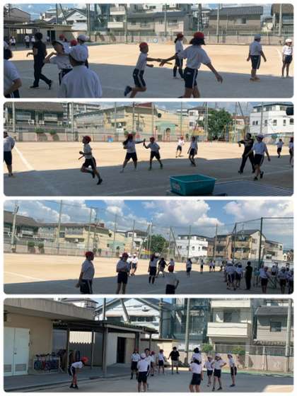 今日も炎天下でとても暑い中、5年生が運動会のリレーに向けて、バトンパスの練習に取り組んでいます。