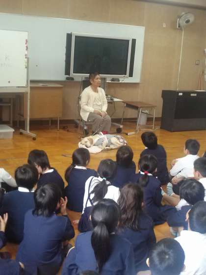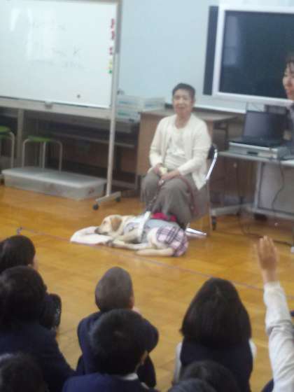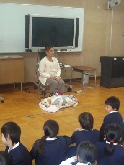 国語の教科書に出てくる盲導犬のお話に関連して、宇根山恵子さんとククルちゃんに来て頂きました。盲導犬や日常生活についてお話頂きました。