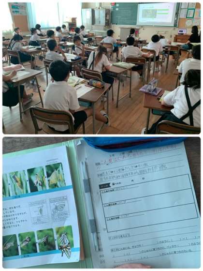 3年生の理科の授業です。いろいろなこん虫の一生を動画を見て、学習しています。「さなぎ」になるこん虫とそうでないこん虫の仲間分けをしました。