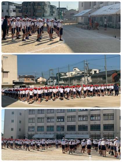 今朝は、全校朝会のあと、運動会の全体練習を行いました。今日はとても天気がよく炎天下の中でしたが、子どもたちはとても張り切って練習しました。運動場にはテントが貼られて、いよいよ運動会が近づいてきた実感がわきます。