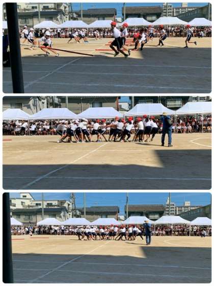 5年生の団体競技、棒引きの様子です。スタートとともに猛ダッシュで棒を取りに行きました。