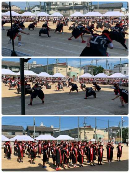 6年生の団体演技、ソーラン節の様子です。自分の名前の一文字を背中に描いたはっぴを来て、とても力強く踊りました。