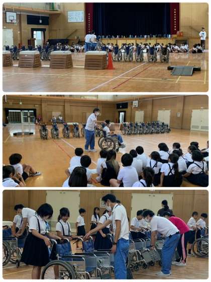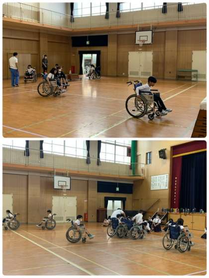今日はリハビリテーションセンターからゲストティチャーをお招きして、3年生が車いすの体験学習をしました。車いすの仕組みや動かし方を教えてもらい、1人ずつ車いすに乗って、1人で動かしてみる体験をしました。