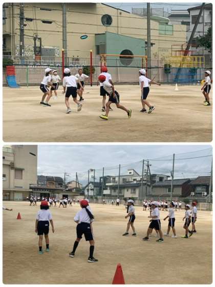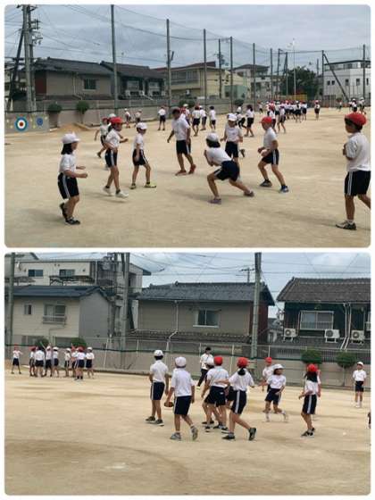 4年生の体育です。フリスビーを使って、「アルティメット」というゲームをしていました。練習を重ねて、フリスビーを投げたり、受けたりするのがとても上手くなりました。