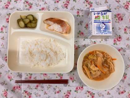 今日の献立は、ごはん、あかうおのしょうゆだれかけ、豚汁、きゅうりのゆず風味でした。