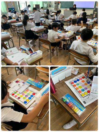 2年生の図工の授業です。絵の具の使い方の練習をしていました。水の量を変えると、同じ原液でも少しずつ色が変わることや、色をまぜて違う色を作ることを楽しんでいました。
