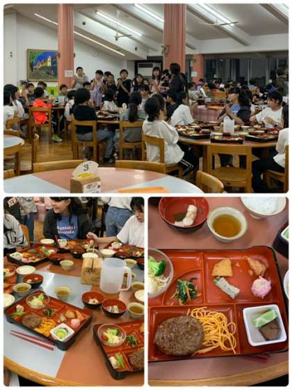 少し早めの夕食です。メニューはハンバーグ定食です。2回目の食事準備はとても手際よく出来ていました。このあとの、キャンプファイヤーに向けて、モリモリ食べましょう!