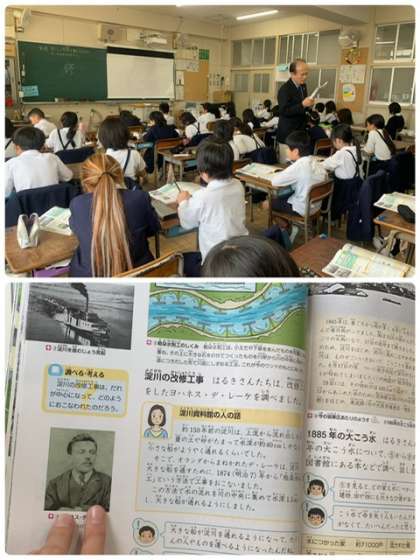 4年生の社会科の授業です。「淀川をつくりかえた人々」という単元で、淀川の治水工事に尽力した歴史を学びました。