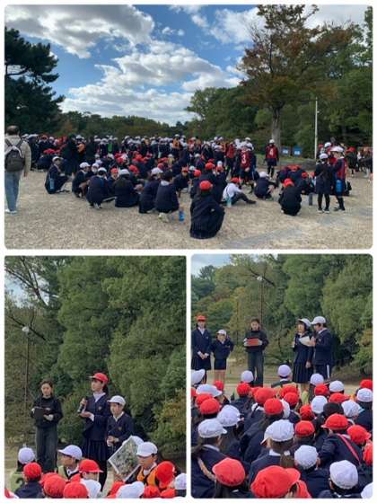 今日は全校遠足で服部緑地に来ています。開会式を終えて、たてわり班でオリエンテーリング、スタートです!