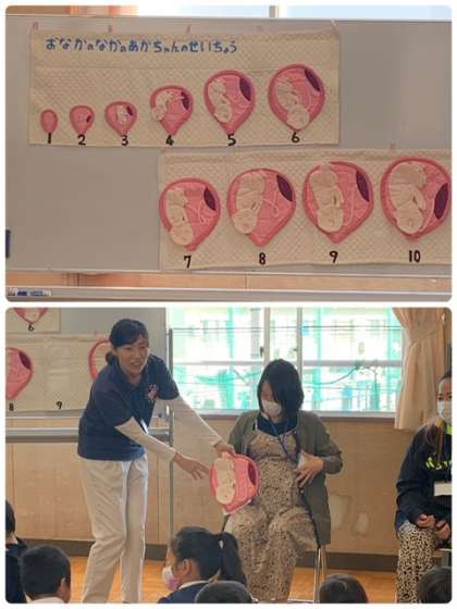 妊娠8カ月と9カ月の妊婦さんのお話も聞き、自分たちが赤ちゃんだった頃のことを想像していました。