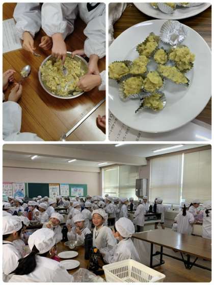 グループの人と協力してスイートポテト作りにチャレンジしました。「おいもをスプーンでつぶすのが大変だったけど、美味しかった」と感想を言ってくれました。