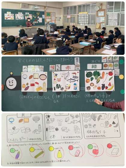 2年生での食育の授業です。今日の給食に使われている食材の栄養と働きについて学習しました。