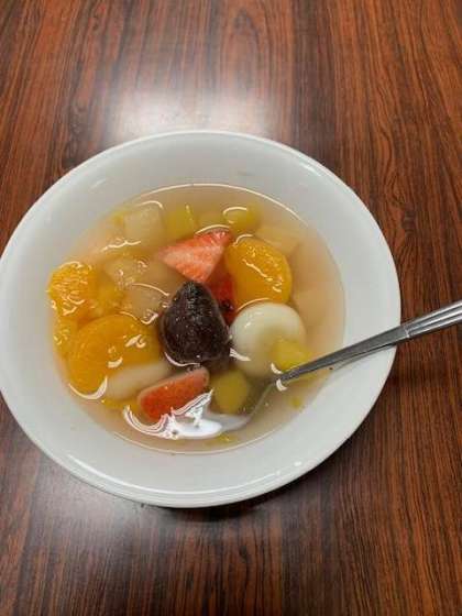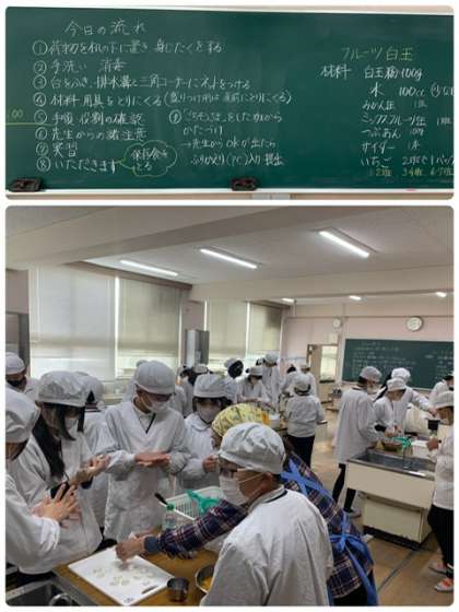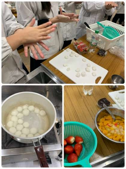 6年生の家庭科の授業です。フルーツ白玉を作っています。班の人と協力して、楽しく実習していました。