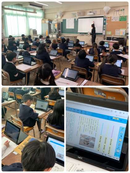 1年生の国語の授業です。「子どもをまもるどうぶつたち」という説明文の読み取りをしています。デジタル教科書に色分けして、線を引いたところの文をワークシートに抜き出して書きました。