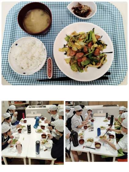 献立は、野菜炒めにお味噌汁とご飯です。お味噌汁のときに使ったかつお節をそのまま炒めてふりかけにしています。