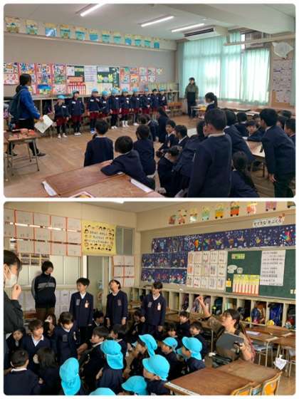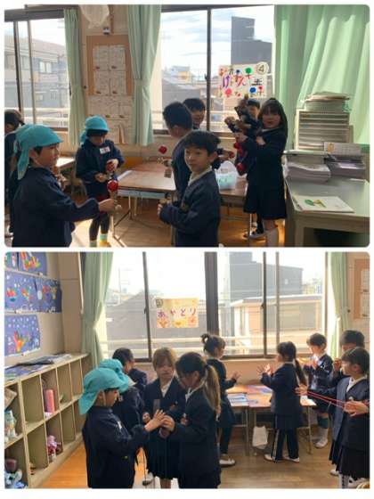今日は1年生と姫島幼稚園の子どもたちとの交流会をしました。この間、1年生が地域の人に教えてもらった昔遊びを、幼稚園の人たちに教えてあげました。