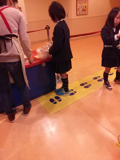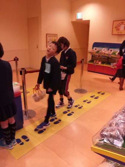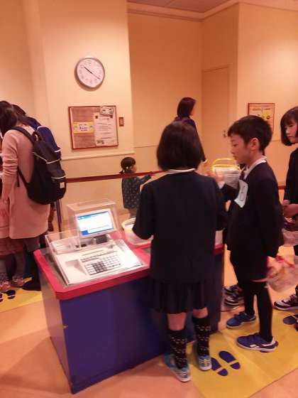 買い物体験。バーコードをかざす体験もしました。