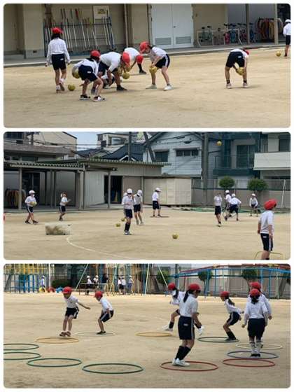 4年生の体育の様子です。鉄棒、うんていなどの固定遊具、フープやボール、ミニハードルなどで、コーナーを作り、いろいろな動きの活動をして体を動かしていました。
