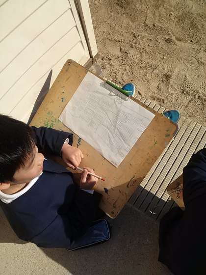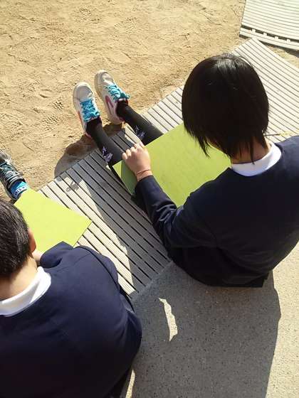 ひなたの暖かいところで版画の下書きを描いています。テーマは「学校の風景」