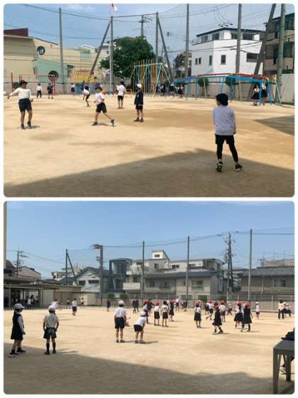 気候がいいので、たくさんの子どもたちが外に出ています。おにごっこや、ボール遊びなどで元気に体を動かしました。
