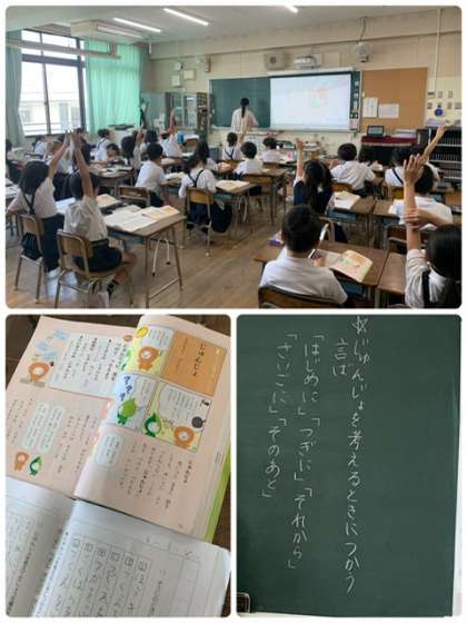 2年生の国語の授業です。じゅんじょを表すことばの学習をしています。接続詞を覚えて、字数の多い作文にチャレンジします。