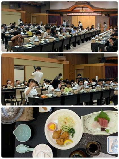 夜ごはんのメニューは豚すき鍋、唐揚げ、お刺身が出ました。苦手なおかずは、シェアしながら、できるだけ残食が出ないようにしました。