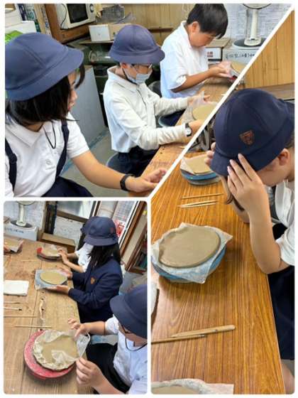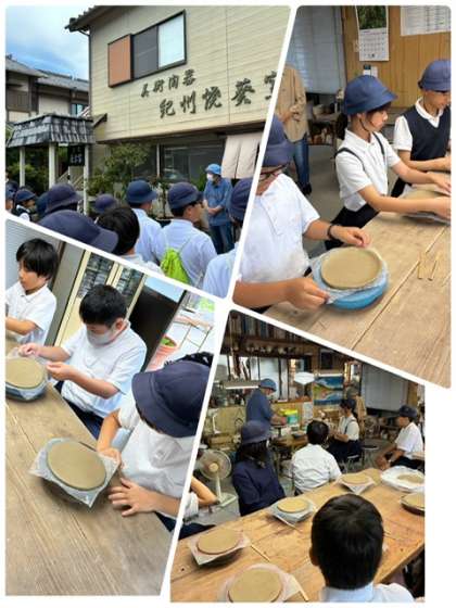 1号車の陶芸体験の様子です。事前に考えた図案を元にお皿作りました。