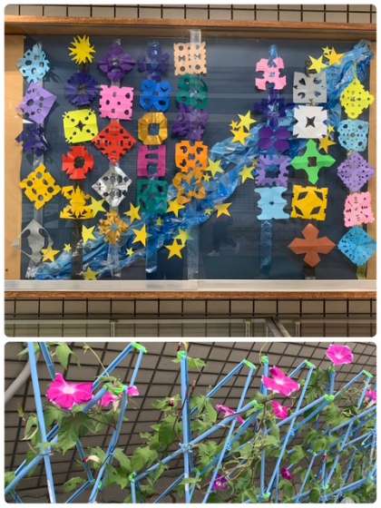 学校の掲示板には一年生の人が作ってくれた七夕の飾りがあり、とても涼しげです。