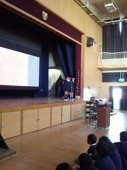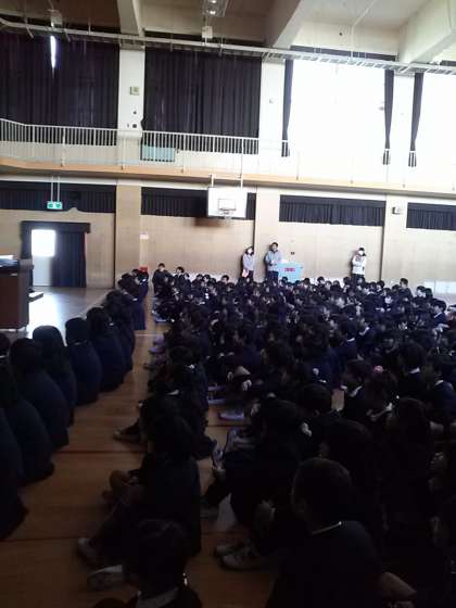 今日の集会は、保健委員会の発表が行われました。続いて、ジュニアバレー&モラロジー作文コンクールで入賞を果たした子どもたちの表彰式が行われました。
