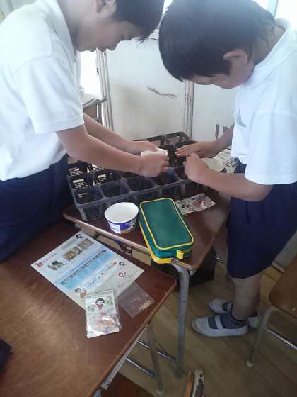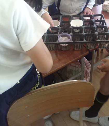 発芽の実験の準備をしていました。社会科の学習とリンクさせて米を育てるそうです。