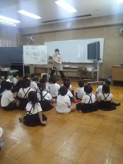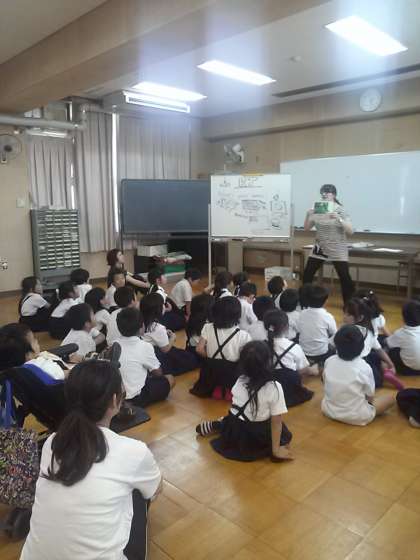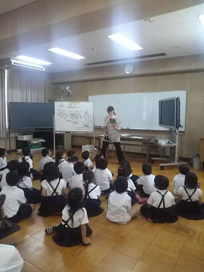 色の学習をしています。「イエロー」「ピンク」「ホワイト」 ケーティー先生に続いて上手に発音していました。