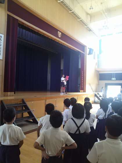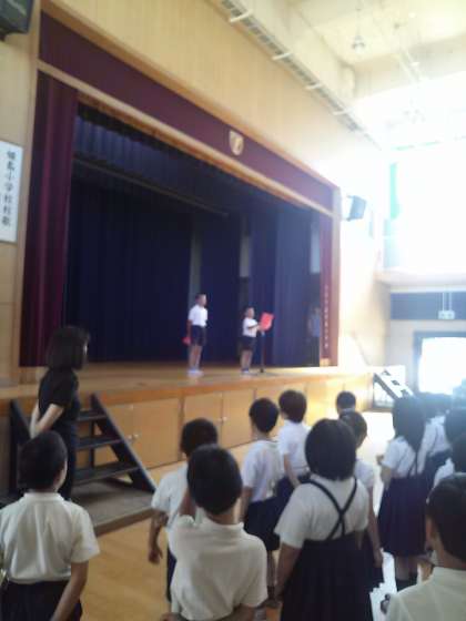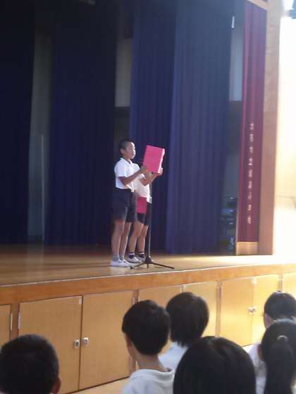 姫島小学校では、毎年終業式の日に各学年の代表の人が作文を読みます。1学期は3年生と6年生です。夏休みに頑張ろうと思うことや2学期の目標についてまとめた作文を読んでくれました。